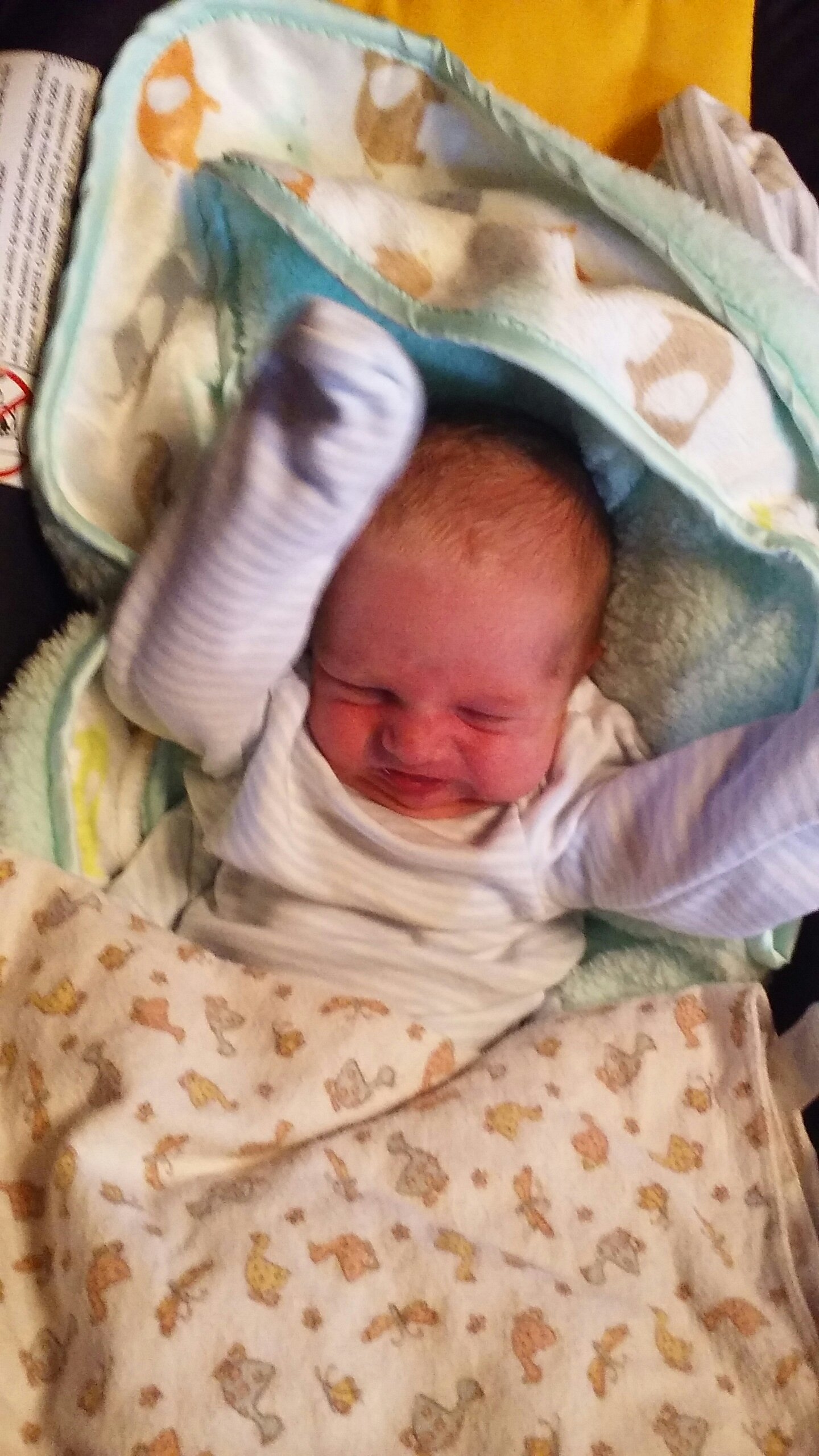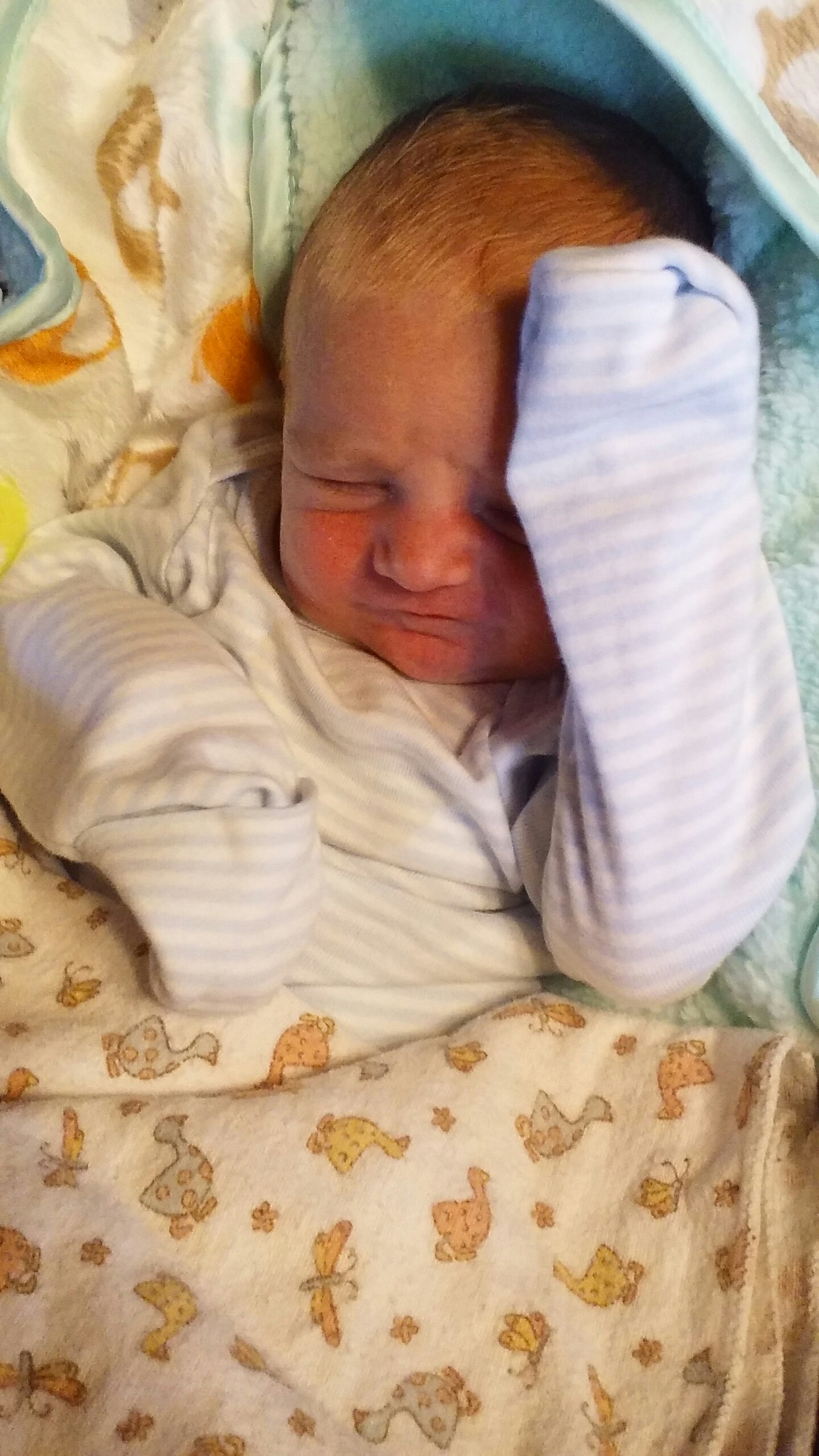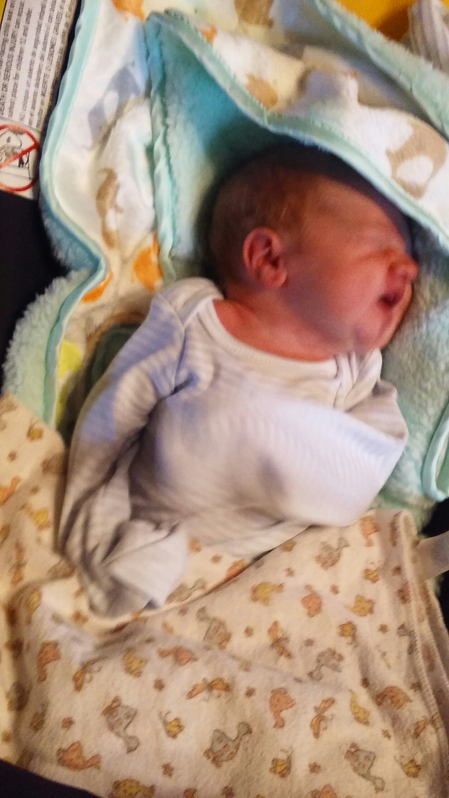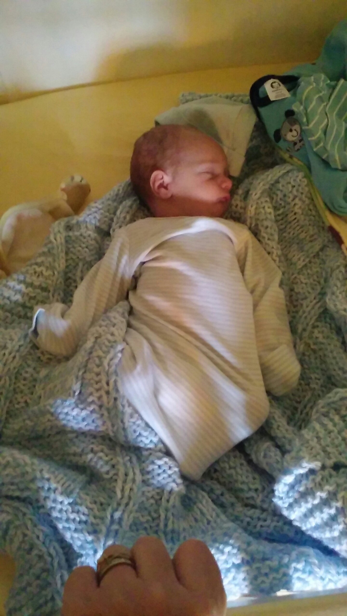 With the new blanket from Grandma Victoria.