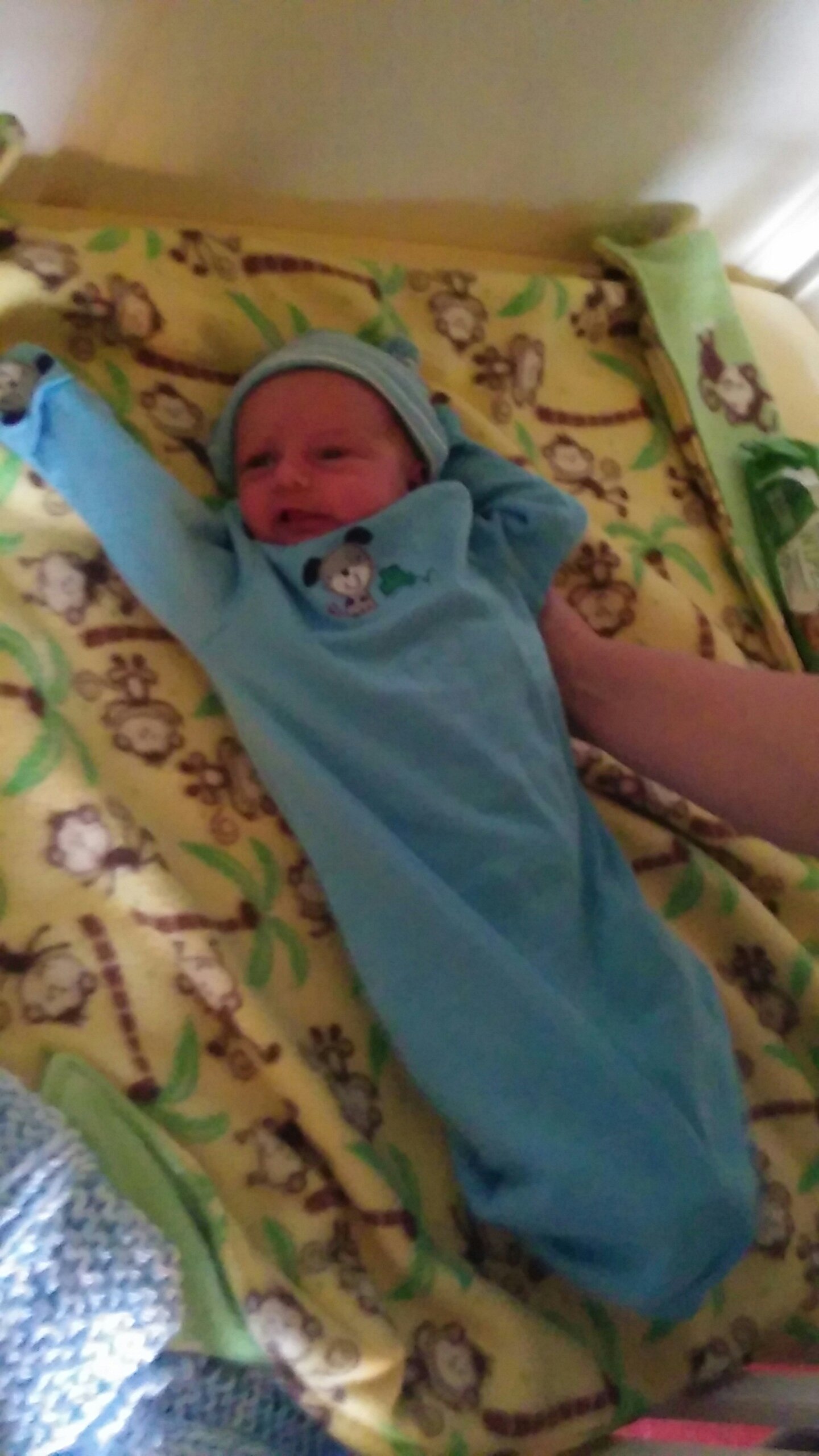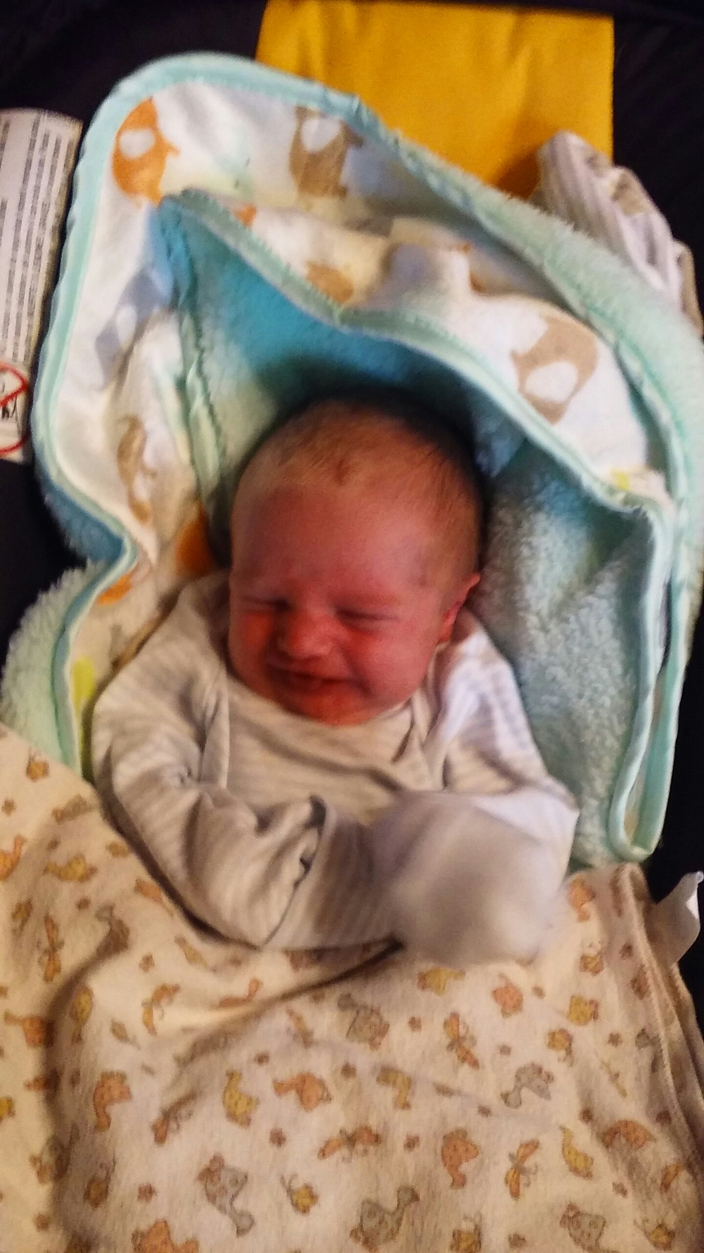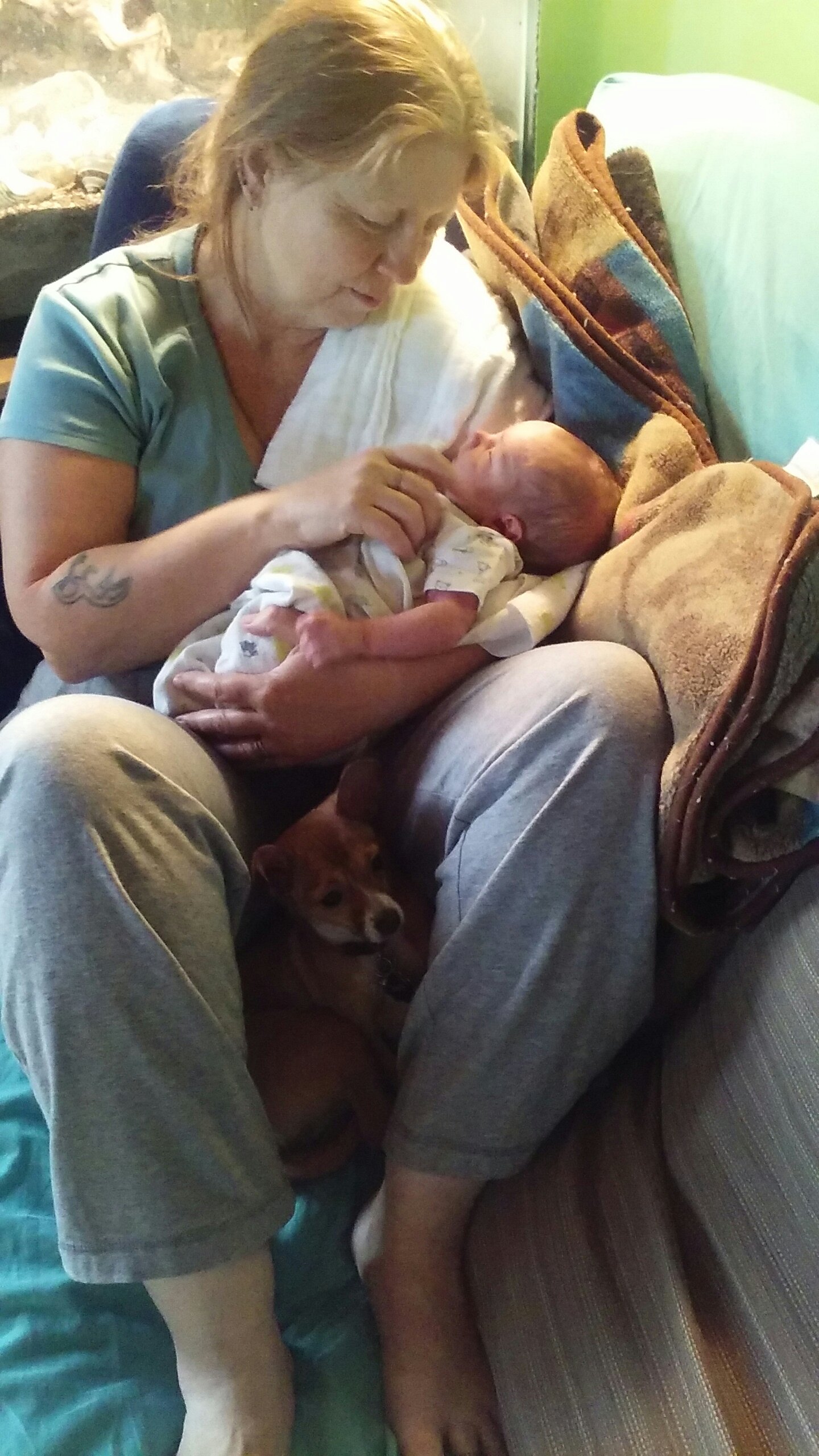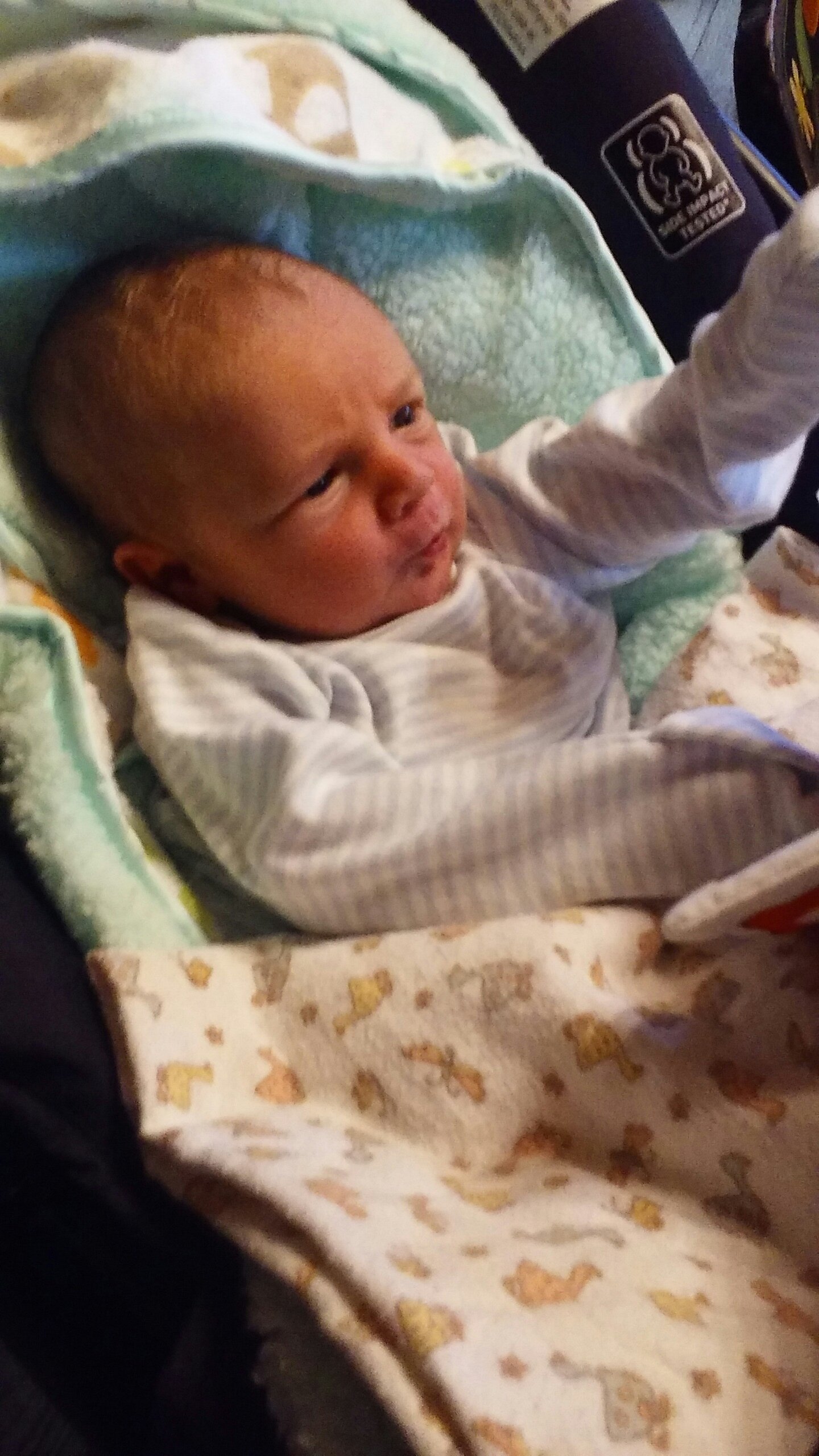 With the new blanket from Grandma Victoria.