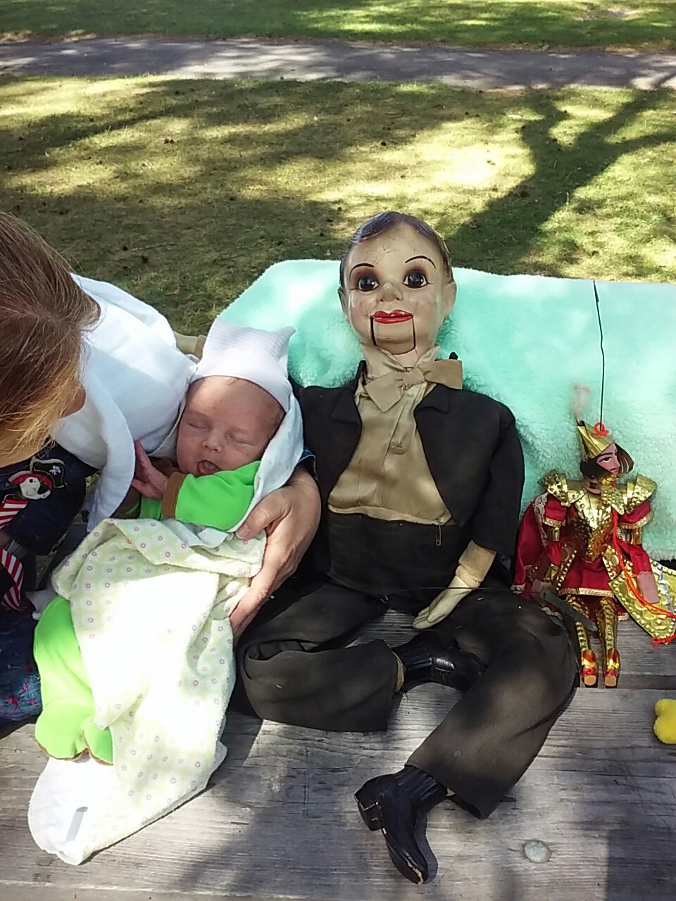 Kieran takes his lunch with Charlie McCarthy and some other puppets at the Guild picnic